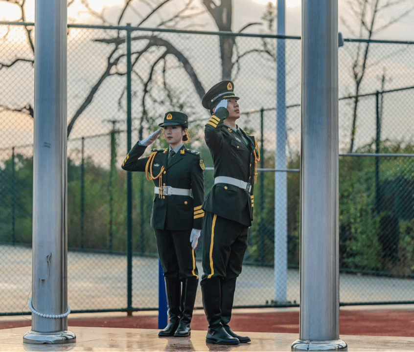 早上七点,升旗仪式正式开始,由2024级会计专硕退役大学生士兵计划学生侯嘉艺、王振钇、王海宁担任升旗手。随着国歌的奏响,鲜艳的五星红旗冉冉升起,全场师生向国旗行注目礼,齐声高唱国歌。